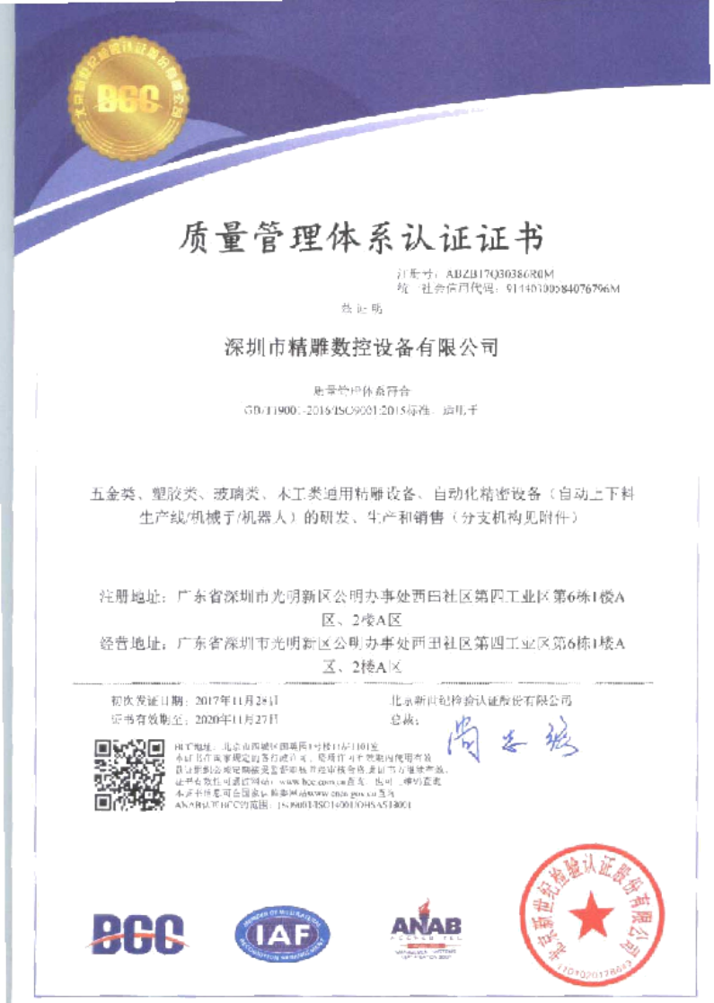 深圳市精雕數(shù)控設(shè)備有限公司,取得,職業(yè)健康安全 管理體系,環(huán)境管理體系,質(zhì)量管理體系三大證書。