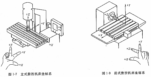 數(shù)控機床各軸的標示乃是根據(jù)右手定則。當右手拇指指向正X軸方向,食指指向正Y軸方向時,中指則指向正Z軸方向。圖1-7所示為立式